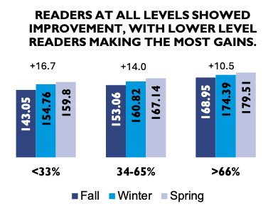 - Students starting the year at lower reading percentiles (i.e., struggling readers) made the most gains.