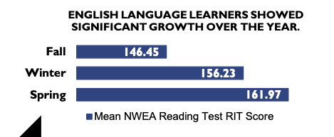 The school also saw significant improvement in literacy achievement for the EL population. The mean NWEA Reading Test RIT Score for English learners increased by 15.5 points from fall 2023 to spring 2024, exceeding the K–2 schoolwide average growth.